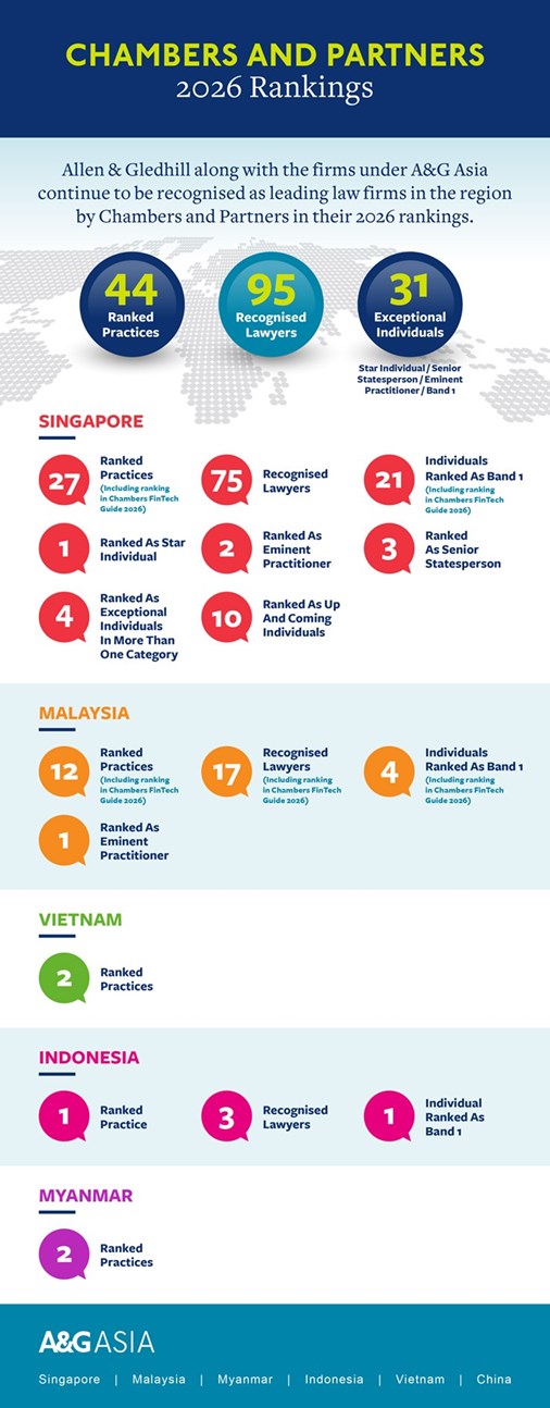 Allen & Gledhill along with the firms under the A&G Asia continue to maintain their leading positions in the region according to the latest rankings released by Chambers and Partners.